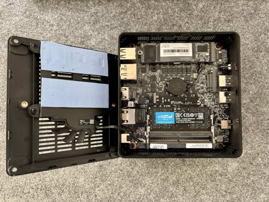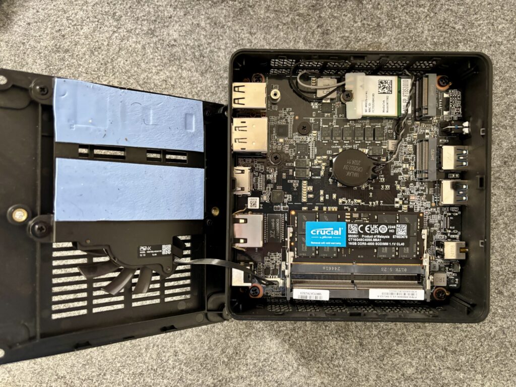 16GB DDR5 Hauptspeicher von Crucial (CT16G48C40S5.M8A1) und eine 512 GB NVMe SSD, sowie WIFI 6E (MediaTek MT7902) komplettieren den Build. Allerdings verzichte ich auf WIFI und verwende den 2,5 GbE Anschluß mit Realtek-Chip.